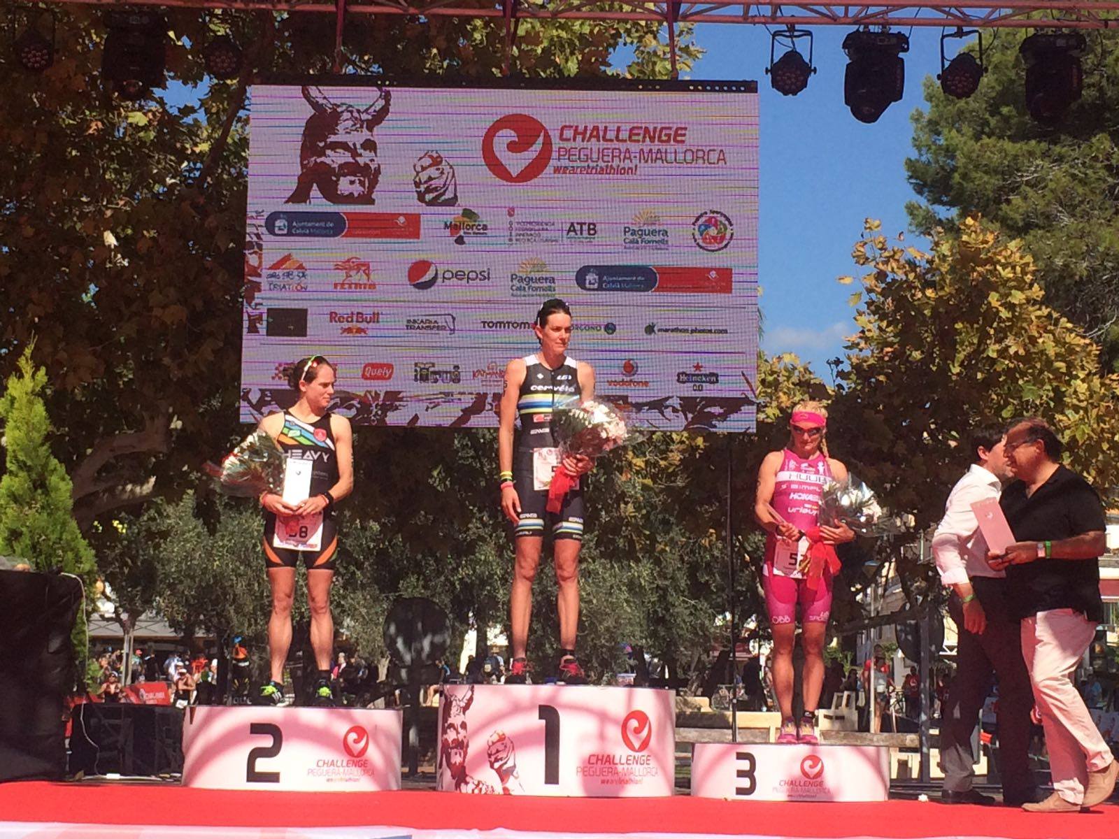 Santimaria moest als eerste overboord en na 10 km had Katrien een voorsprong van 30 seconden op Van Vlerken bij elkaar gelopen. Die 2de plaats zou de Belgisch kampioene niet meer uit handen geven. Na haar overwinning in het ironmancircuit knoopt de Belgische nu ook aan met een podiumplaats binnen de Challenge Family. Voor Sofie Goos werd het op het Spaanse eiland een grote inhaalrace. Na het zwemmen lag ‘La Goos’ op de 13de plaats, 5 minuten na de kop van de wedstrijd waaronder heel wat olympisch geweld. Maar Goos is een dame boordevol ervaring en stelselmatig rukte de Belgische atlete op binnen de top 10. Als 7de dame begon ze aan de afsluitende halve marathon. Daar haalde Sofie nog 2 andere atletes bij en kwam luttele secondes tekort om ook de Italiaanse Santimaria nog voorbij te snellen. Sofie Goos beëindigt zo deze Challenge Peguara-Mallorca op een mooie 5de plaats.