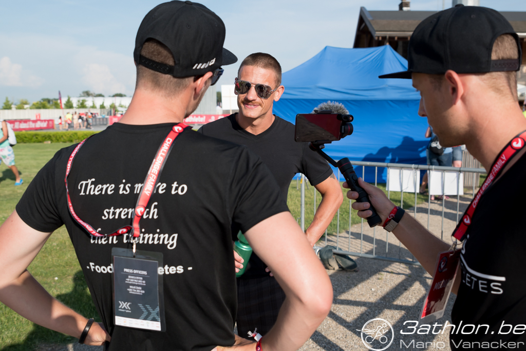 Als we iets later ons nieuwste redactielid Ien op hem afsturen, hebben we zo een interview te pakken met de titelverdediger. En hij staat ons met veel plezier te woord. Want wij willen vooral horen wat hij van de Belgen vindt. “De Belgen zijn altijd sterke fietsers en lopers. En eigenlijk is Bart Aernouts één van de triatleten die mij inspireerde om zelf een sterkere fietser en loper te worden. Dit zijn de jongens waar je rekening mee moet houden in de laatste helft van de wedstrijd. En dit is echt een parcours voor de sterke fietsers en lopers. Het wordt niet veel beter dan dit, een mooi vlak parcours, een non-drafting zone van twintig meter… We zullen zien wie er nog snel kan lopen na een stevig fietsonderdeel. Ik durf nu op niemand in te zetten, we zien morgen wel, maar laten we er een mooie strijd van maken,” aldus The Colonel.